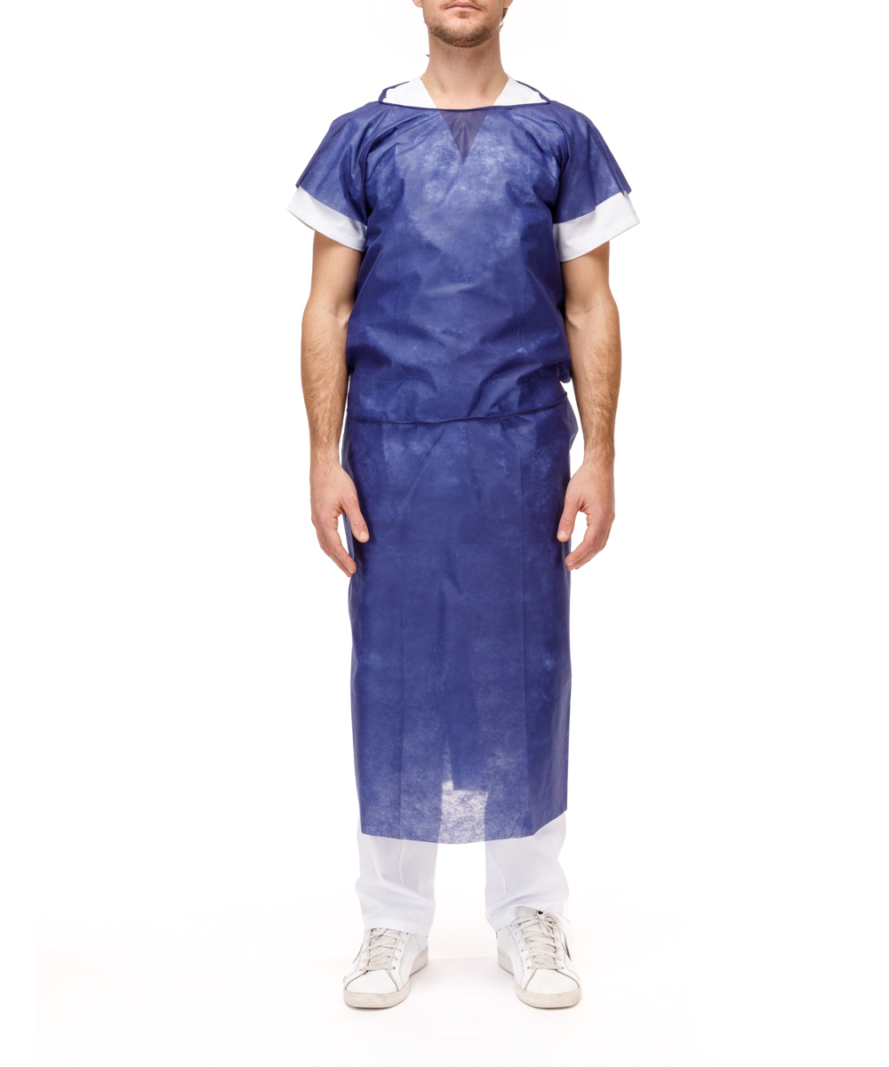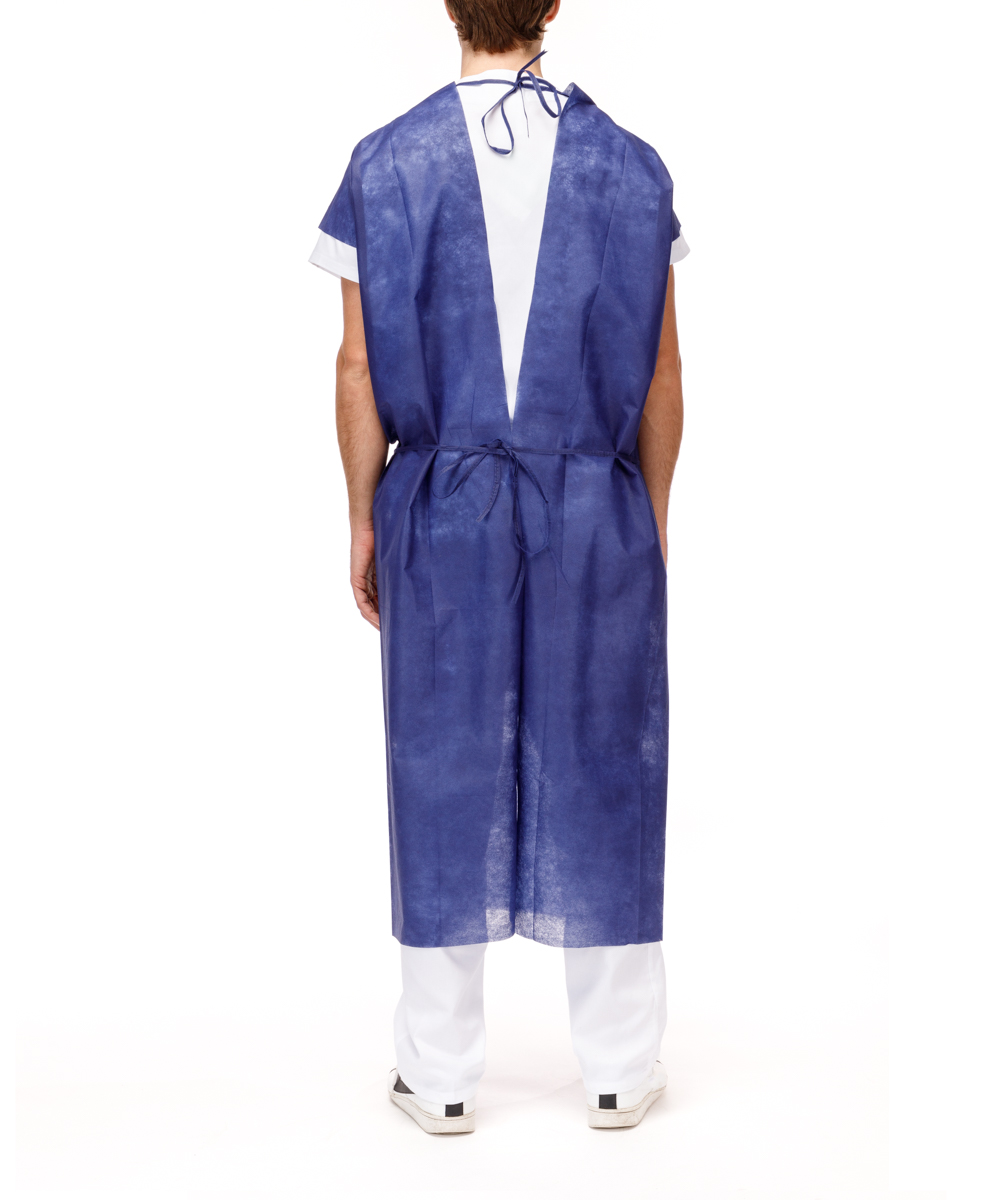 Bata fabricada en prolipropileno de 45 grs, sin mangas, cuello redondo y cierre mediante cintas.