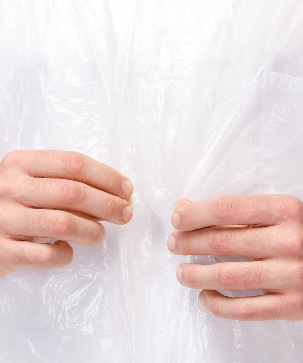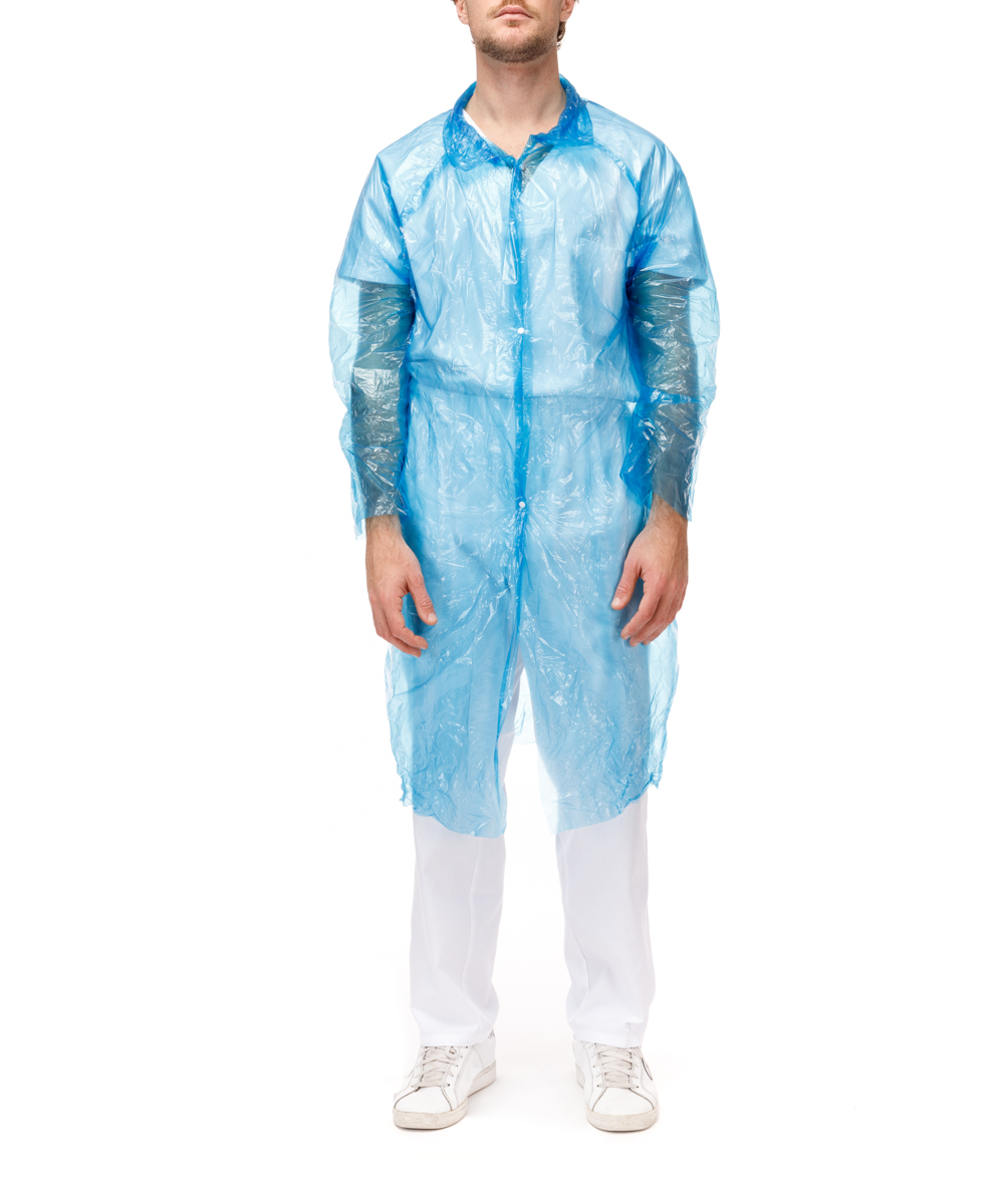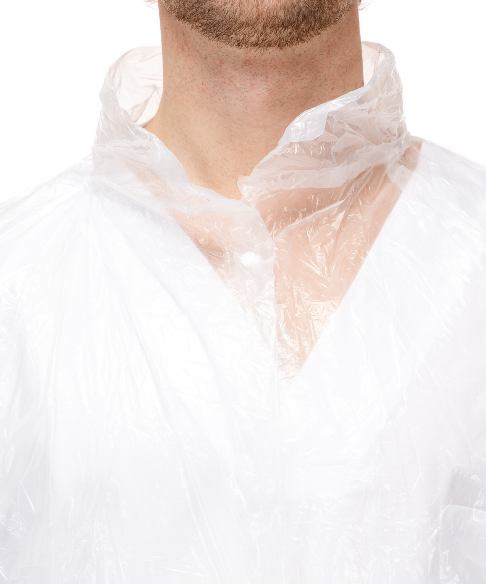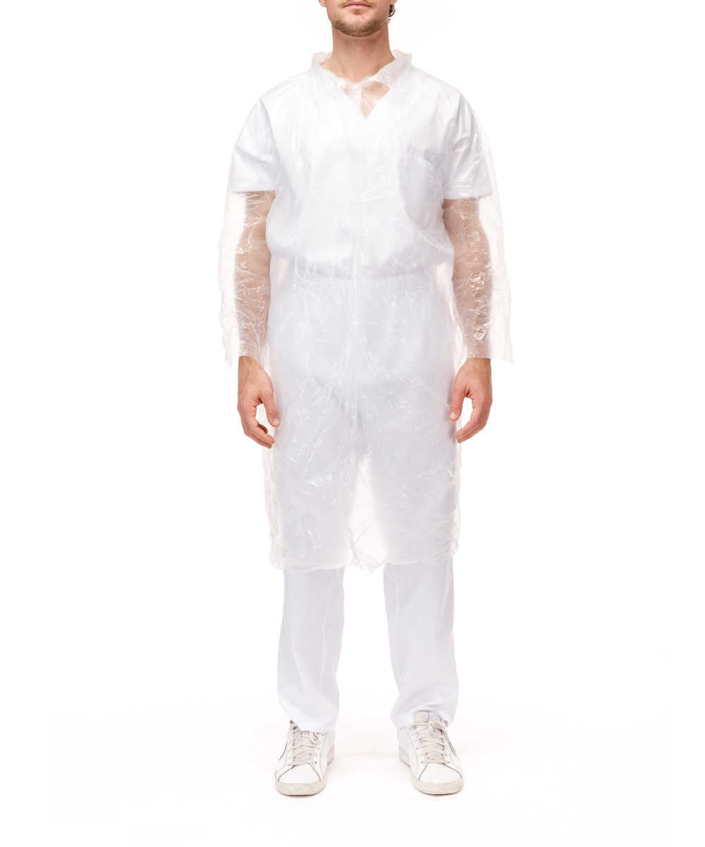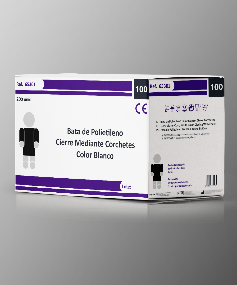 Bata fabricada en polietileno (LDPE). Cierre mediante corchetes plásticos de presión y cuello camisa.