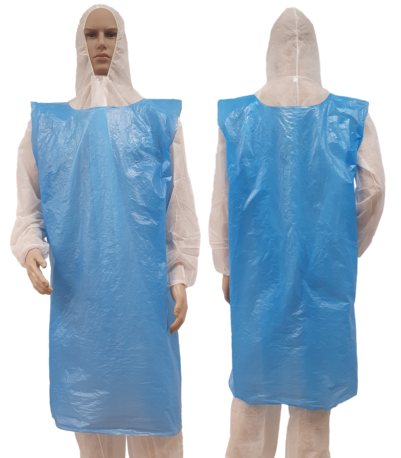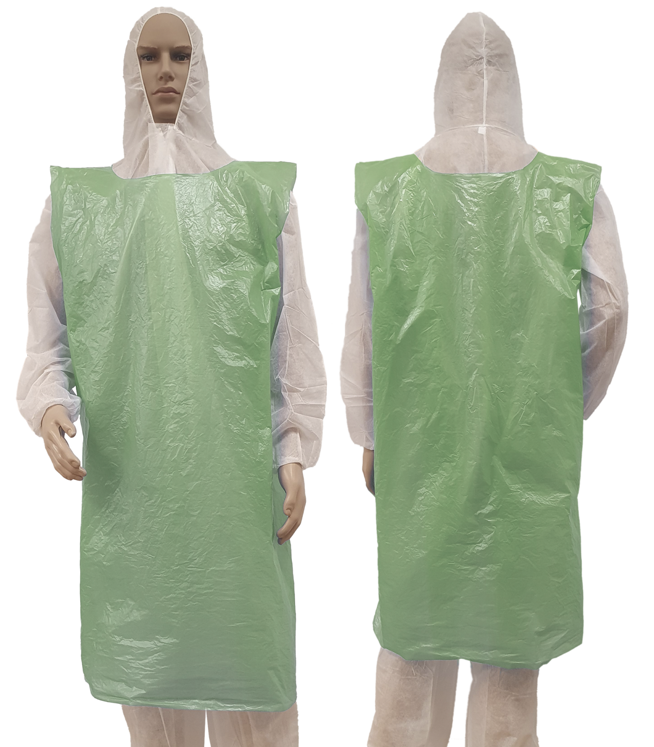 Delantal fabricado en polietileno. Con abertura para cabeza y brazos, cubre desde los hombros hasta las rodillas.