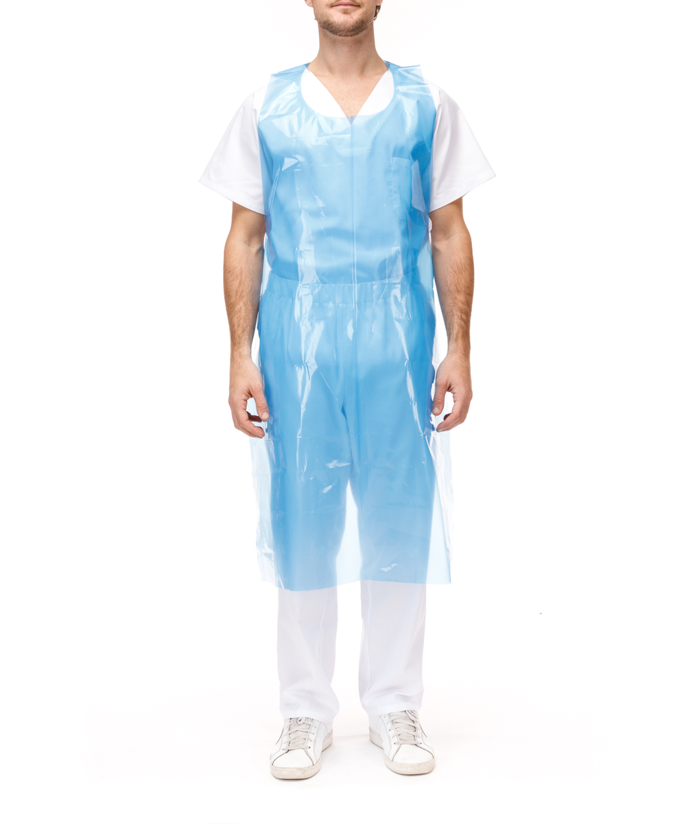 Delantal en polietileno (LDPE) de 65 micras. Con abertura en la cabeza y sujección mediante tiras en la cintura. Formato envase individual.