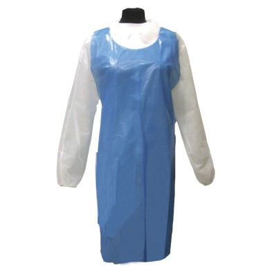 Delantal en polietileno (LDPE) de 20 micras. Con abertura en la cabeza y sujección mediante tiras en la cintura.