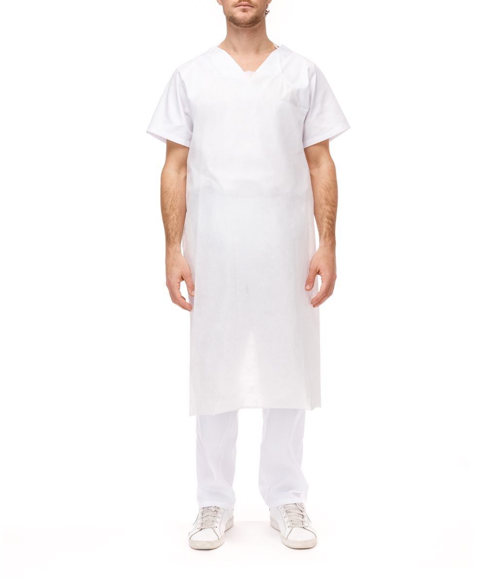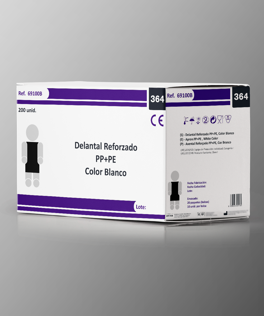 Delantal fabricado en Polipropileno y con lámina de Polietileno impermeable. Con cintas para sujeción en cuello y cintura.
